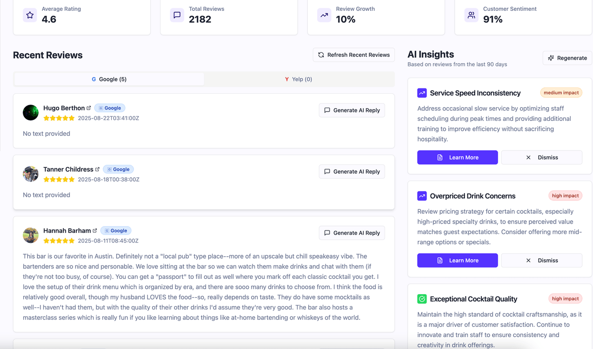 Review trend analysis, sentiment tracking, keyword extraction, and operational reporting with actionable insights.